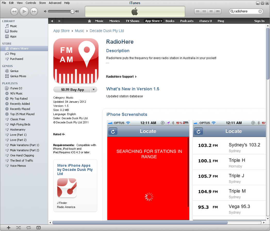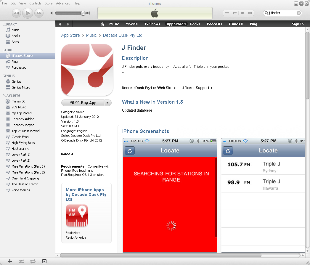 I have decided at Petesmusic blog to diversify into the area of technology. This is my first blog in this very area. I am reviewing three different apps that are available on the Australian iTunes Store. I did a search on iTunes with the keyword Triple J & I found an interesting app called J Finder.Triple J is the Australian Broadcasting Corporation’s National Youth Network. J Finder finds in your local area the frequencies for Triple J. It works online & offline as well. It is available for the iPhone. The app was not too expensive either for 99 cents. After getting the J Finder, I was interested in finding out other apps by a company called Decade Dusk Pty Ltd. Their support link goes to their Facebook page. It gives background information about this company. I found out as well that Decade Dusk Pty Ltd makes two other apps called RadioHere & Radio America. I decided to give RadioHere a try as well. This app is to do with Australian radio frequencies. It does give you all the frequencies for all local radio stations. As well, you can find all frequencies for all Australian radio frequencies. I live in Sydney, Australia where I can all Sydney radio frequencies. I was on holiday in outer suburban Brisbane. It was quite handy as I had a friend listening to regional radio stations. It gave me the name, frequency & the area where the radio stations were operating from. Decade Dusk Pty Ltd do another app with information for all American radio stations. I haven’t tried it yet. It is the American equivalent of the RadioHere. If I ever go to the United States, it should come in handy. All these follow apps I have reviewed, I do highly recommend. Good value & a very good quality. You won’t be disappointed.